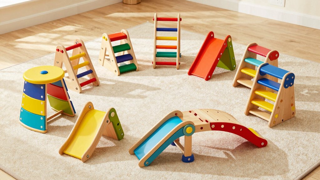 The Deli 7-in-1 Toddler Climbing Triangle Set stands out as a versatile and durable option for families seeking an all-inclusive indoor play solution. Made from natural, non-toxic wood, it’s built to withstand active play while meeting strict safety standards. The set includes a Pikler triangle, climbing ramp, and rainbow rocker, offering multiple play modes like climbing, sliding, and rocking. Its adjustable heights support different ages, and the foldable design makes storage easy. Kids can explore, build strength, balance, and confidence through imaginative activities. Overall, it’s a safe, engaging, and flexible set that grows with your child’s development.