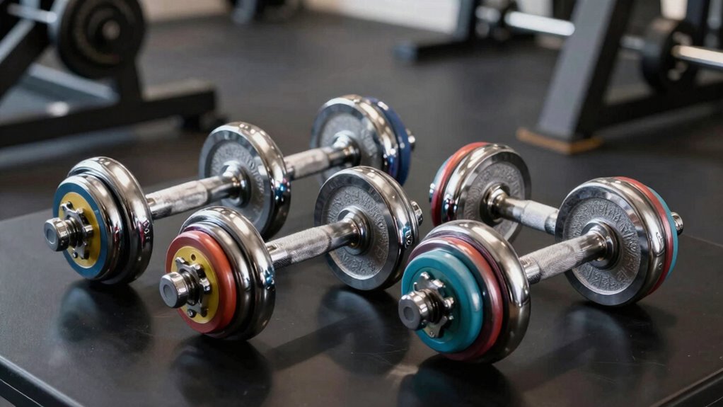A space-saving design is essential if you want to keep your home gym organized and clutter-free. These adjustable dumbbell sets combine multiple weights into a compact form, eliminating the need for several individual dumbbells cluttering your space. They often feature quick adjustment mechanisms like twist locks or dials, which make changing weights seamless without taking up extra room. The ergonomic, streamlined shape maximizes your workout area, perfect for small home gyms. By replacing multiple traditional dumbbells, these sets help maintain an organized environment, making your workout space more inviting and less chaotic. The overall dimensions are designed to be compact, fitting easily into small storage areas or racks, ensuring your home gym remains tidy and efficient.