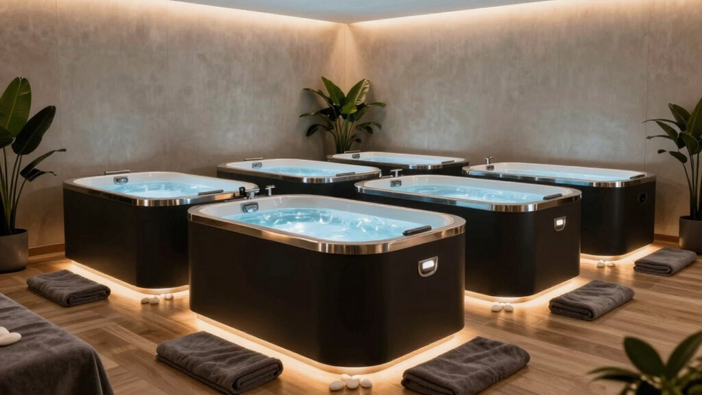 When selecting an indoor cold plunge tub, it’s vital to take into account how easy it will be to keep it clean and well-maintained over time. Regular cleaning and sanitizing of the tub’s surface are essential to prevent bacterial growth and keep hygiene levels high. Draining and drying the tub thoroughly after each use helps prevent mold, mildew, and water stagnation. Look for tubs with built-in drainage systems or quick-release valves—they make water removal and cleaning much simpler. Choosing a material that’s easy to clean and resistant to stains or corrosion can extend the lifespan of your tub. Additionally, inspect seals, support structures, and insulation periodically to guarantee everything functions at its best and maintains performance over years of use.