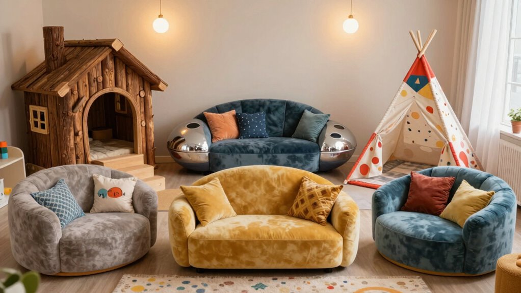 Selecting a fort building couch that matches your child’s age involves considering safety features and design complexity suited to their developmental stage. I look for models with rounded edges and non-toxic materials to guarantee safety. Adjustable or flexible configurations are essential to accommodate a child’s size and abilities, making play both fun and safe. For younger kids, I prefer simpler structures that are easy to assemble and less likely to tip over, while older children benefit from more intricate designs that challenge their motor skills and creativity. Removable, washable covers are also a must for easy maintenance, especially for younger kids prone to spills. Ultimately, I check the size and weight capacity to confirm stability and safety, preventing any risk of collapse or tipping.
